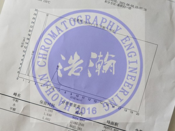 2. 色谱柱多采用高分子小球,出峰顺序为:甲醛,水,甲醇,因甲醇含量低,且处在拖尾水峰后面,灵敏度低,甚至被覆盖不出峰。